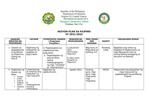 Samakatuwid, ang aksyon plano ay isang mahalagang kasangkapan sa pagpaplano at pamamahala ng mga proyekto o gawain. Sa pamamagitan ng detalyadong pagbuo nito, mas madali nating matutugunan ang mga isyung kinakaharap at maabot ang mga layunin. Sa bawat hakbang na ating gagawin, mahalaga ang pagkilala sa mga responsibilidad, pagtataya ng mga sukatan, pag-organisa ng mga mapagkukunan, at regular na pag-monitor at evaluasyon. Sa pamamagitan ng pagkakaisa at determinasyon, mas magiging matagumpay at epektibo ang ating mga aksyon.